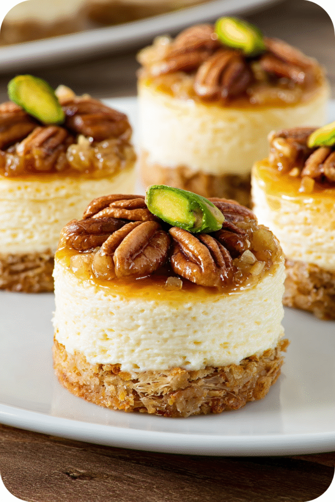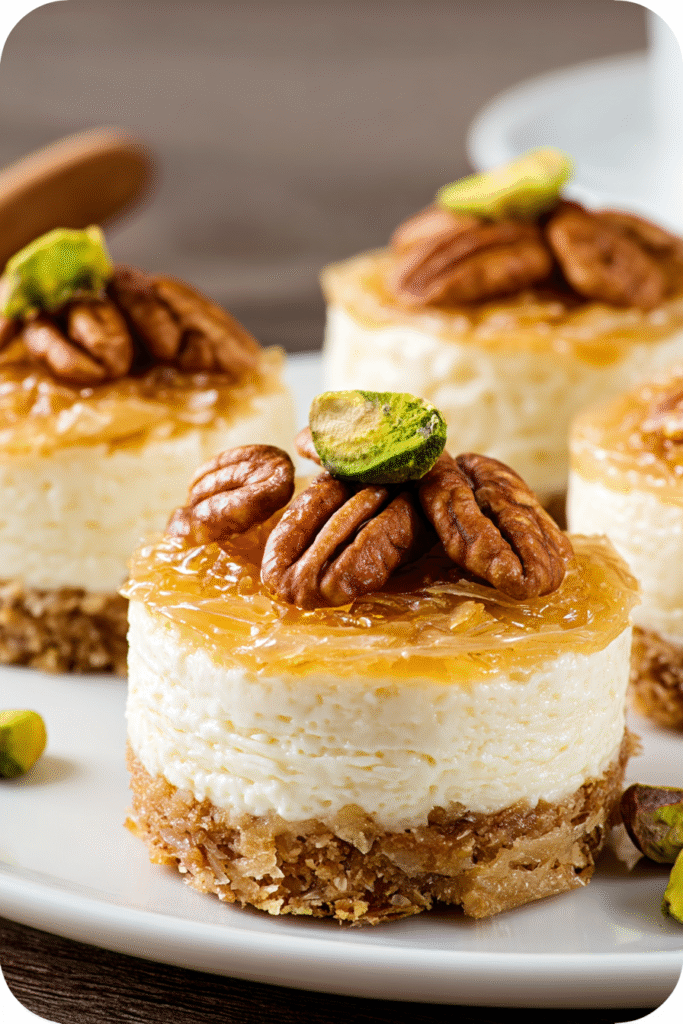 Mini Baklava Cheesecakes represent the successful marriage of two beloved dessert traditions into an innovative format that satisfies on multiple levels—visually striking, flavor-complex, and emotionally comforting. This recipe appeals particularly to those seeking elegant desserts that don’t require professional pastry training, food enthusiasts wanting to explore flavor fusion, or anyone desiring impressive presentations that appear far more complicated than their actual preparation. The individual format solves the common problem of cheesecake’s difficult slicing and serving, making these particularly appropriate for entertaining situations where you want impressive presentation without last-minute plating complications. The ahead-friendly nature allows hosts to prepare dessert days in advance, freeing mental energy and kitchen space for other meal components. While the 240-260 calorie estimate per cheesecake represents substantial indulgence, the small portion size combined with rich, complex flavors means these satisfy as elegant conclusion to meals without requiring large quantities. For those seeking lighter versions, consider using Greek yogurt to replace half the cream cheese, reducing sugar slightly, or using reduced-fat phyllo if available; though these modifications will alter the signature richness that makes these special. Ultimately, these mini cheesecakes deserve a permanent place in the entertaining dessert repertoire as proof that fusion cooking and culinary creativity don’t require innovation through complexity—sometimes the simplest ideas, thoughtfully executed, create the most memorable eating experiences.